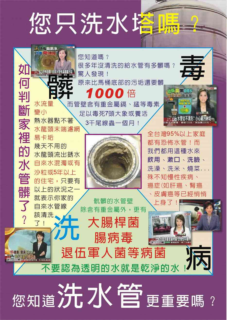 日本,是個先進的國家,也是個長壽的民族,在日本"水管清洗"已行之有年,因為他們非常重視生活品質,所以早已研發出清洗水管的技術.如今引用他們的技術,也得以解決我們所面臨的問題. 所謂的水管清洗,其原理就是,將壓力打入水管內,由於壓力在水管內會形成所謂的水槌清洗”設備,不洗不知道,從自來”水管”內,竟可清洗出黑色、赭紅、濁白色的污水,令人咋舌! • 從水塔到自家 水質是否被污染 • 如何維護家中自來水的水質乾淨,一般民眾知道每半年要清洗一次大樓水塔,卻很少人去”清洗自來水管”壁內的陳年污垢,換句話說,只重視頭端,忽略中間到傳輸端污染。 • 專家:屋齡逾五年管壁開始腐蝕 • 國內建築物的水管,大多採用PVC管或鐵管,一般而言,屋齡超過五年的房子,自來水管壁便會開始腐蝕,並產生水鏽,隨著時間越久,鏽蝕、積垢的情形便日益嚴重。
